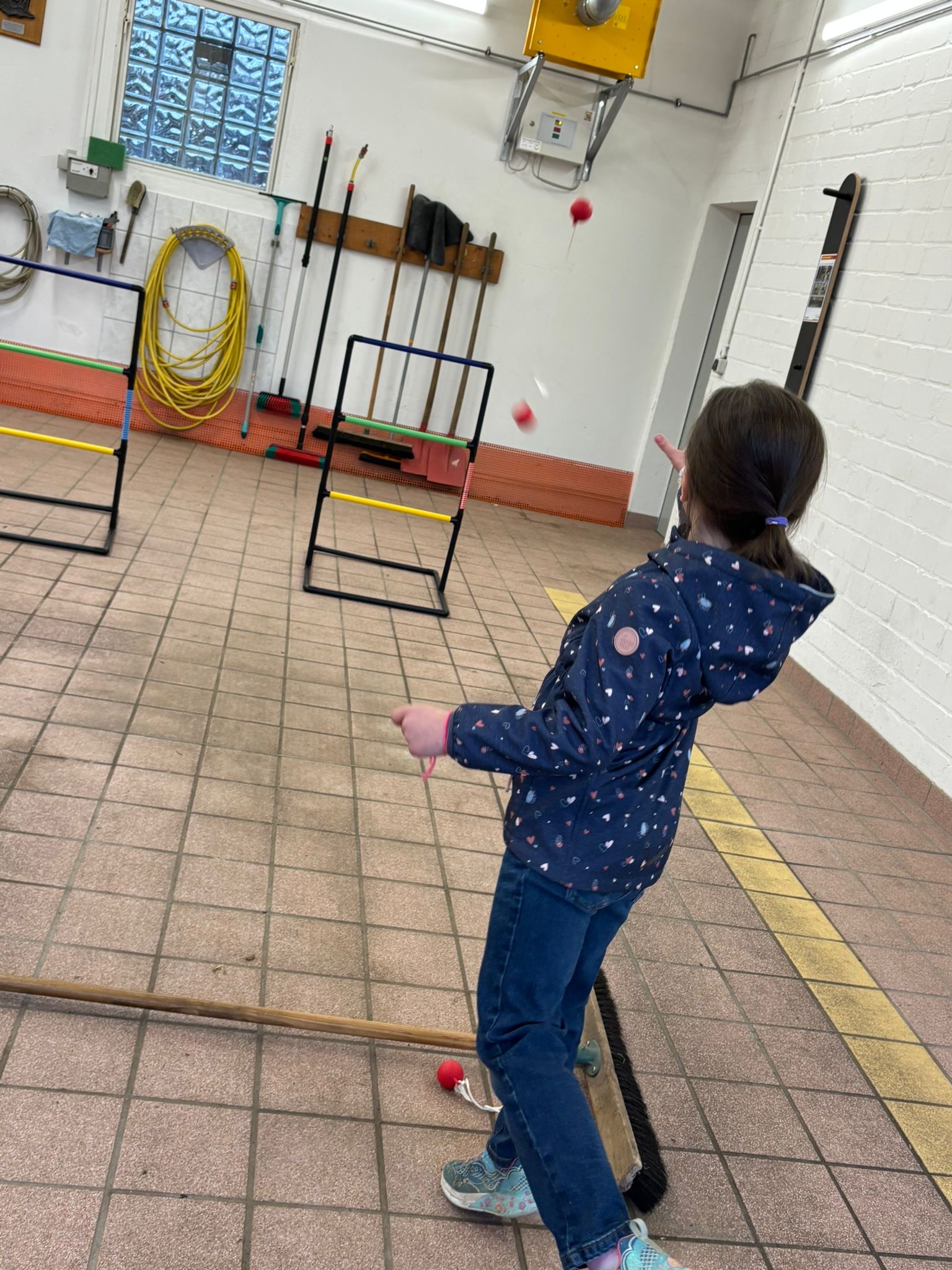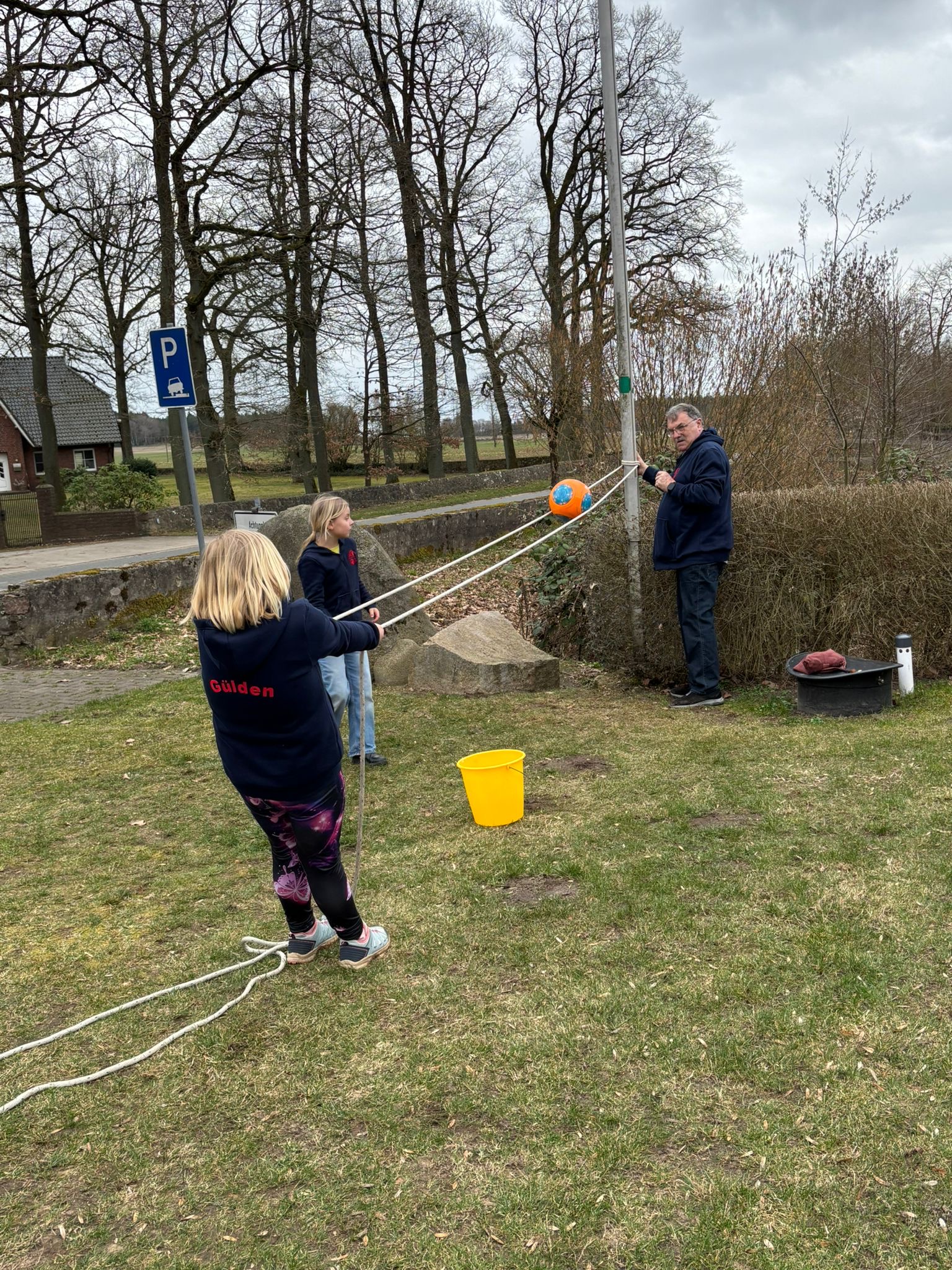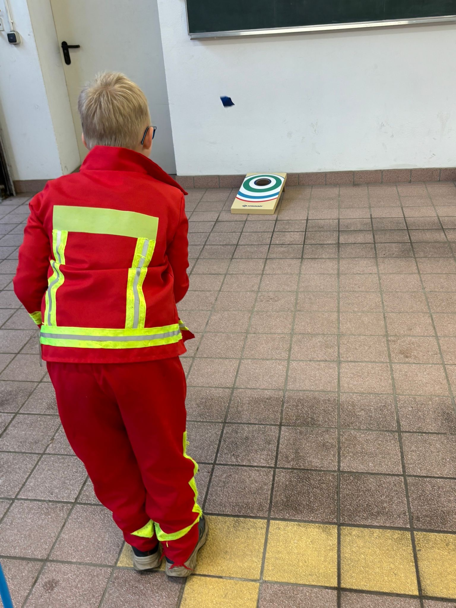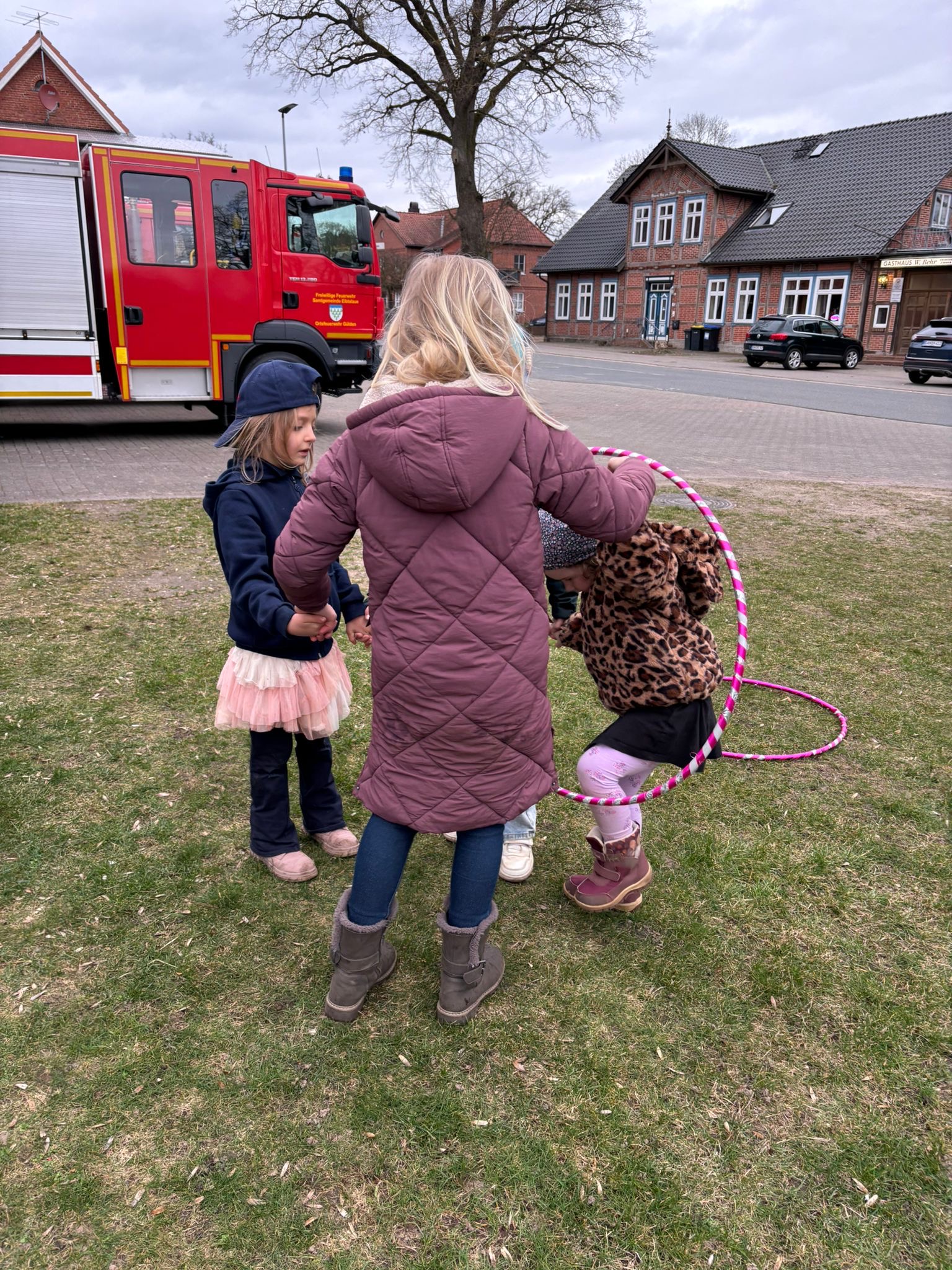 Auch Geschicklichkeit und Teamarbeit waren gefragt. Bei einer Übung mit Seilen mussten die Kinder gemeinsam einen Ball steuern und in einen Eimer befördern. Weitere Spiele forderten Koordination, Treffsicherheit und Zusammenarbeit. Zwischendurch blieb natürlich auch Zeit, das Feuerwehrfahrzeug genauer anzuschauen.