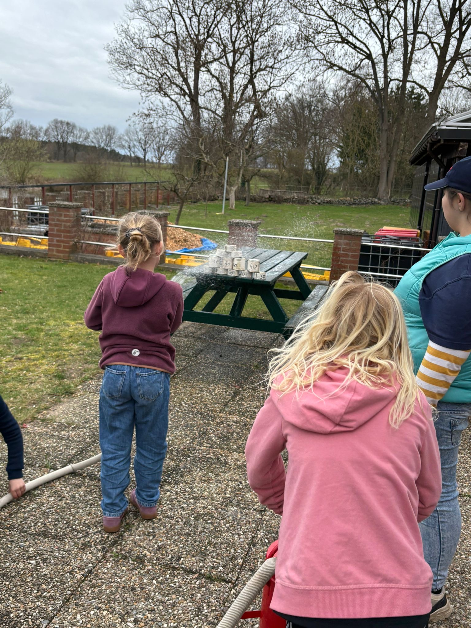 An mehreren Stationen konnten die Kinder verschiedene Aufgaben ausprobieren. Besonders viel Freude bereitete eine Übung mit der Kübelspritze. Dabei galt es, mit dem Wasserstrahl aufgestapelte Zielklötze zu treffen und umzuspritzen. So konnten die Kinder spielerisch erste Erfahrungen mit typischen Feuerwehrgeräten sammeln.