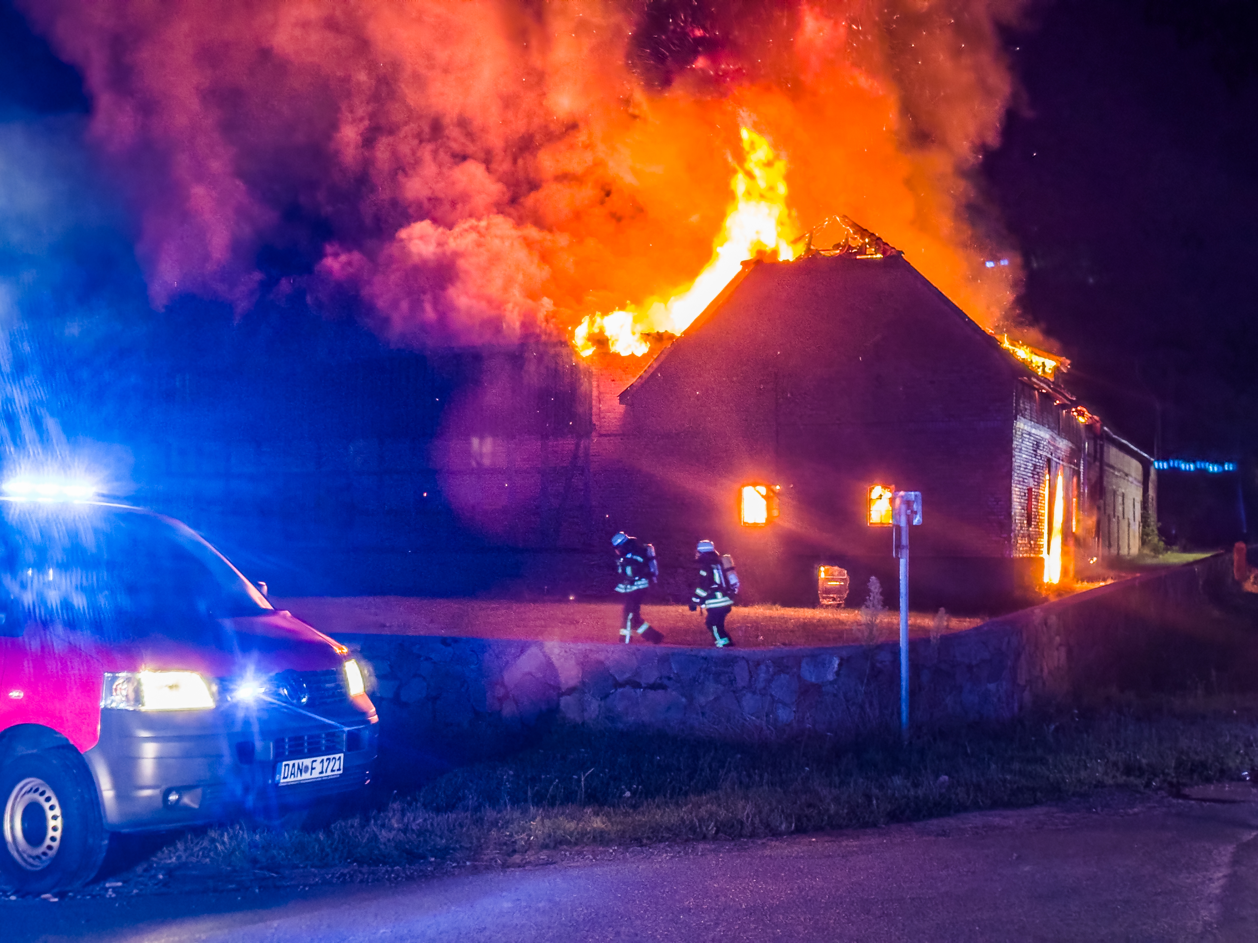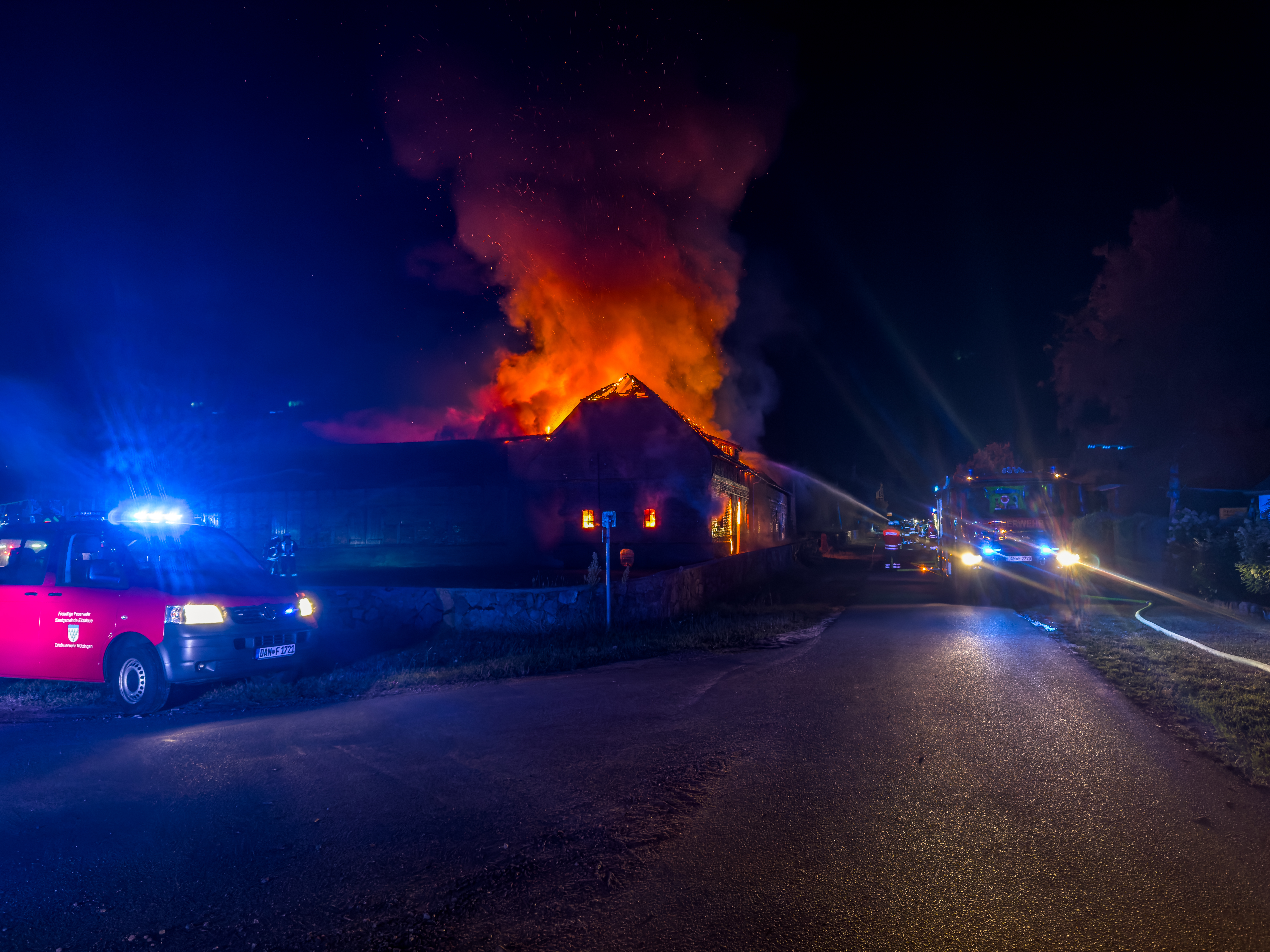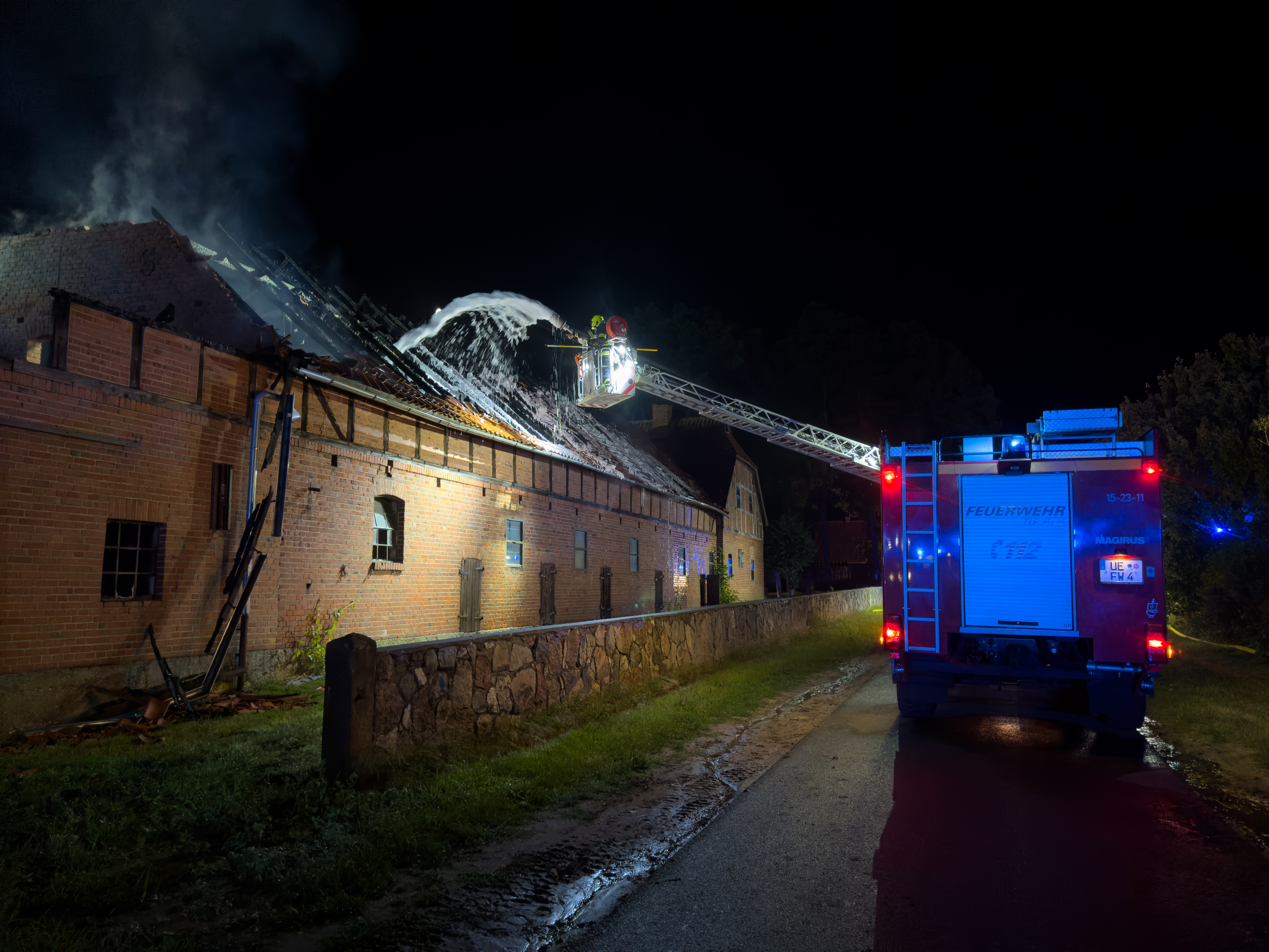 Vor Ort bot sich den Einsatzkräften ein dramatisches Bild: Ein Scheunengebäude stand bereits in Flammen. Noch während der Anfahrt wurde eine vermisste Person gemeldet, die glücklicherweise wenig später unversehrt aufgefunden werden konnte. Die Einsatzleitung bildete sechs Einsatzabschnitte, um das Feuer gezielt zu bekämpfen. Zur Unterstützung wurden die Drehleitern aus Dannenberg und Uelzen angefordert. Beide Fahrzeuge kamen im Verlauf des Einsatzes auch zum Einsatz, um unter anderem Teile des Daches zu öffnen und Brandnester im Giebelbereich gezielt abzulöschen.