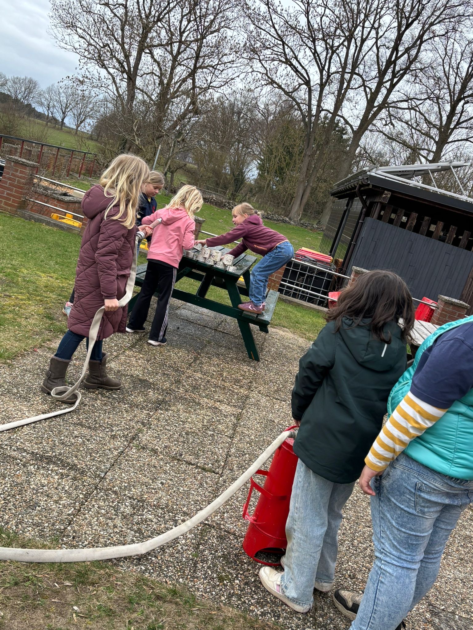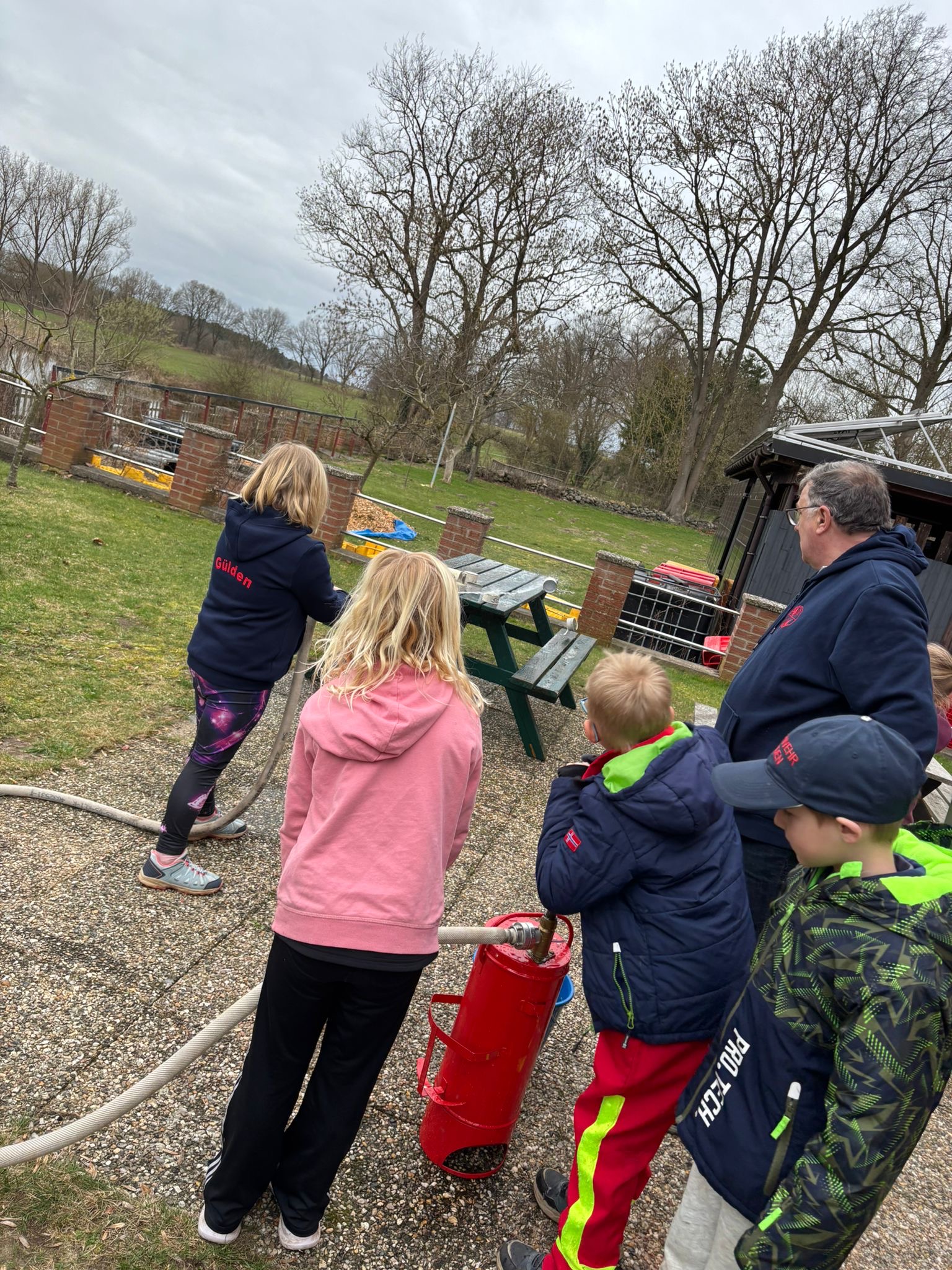 An mehreren Stationen konnten die Kinder verschiedene Aufgaben ausprobieren. Besonders viel Freude bereitete eine Übung mit der Kübelspritze. Dabei galt es, mit dem Wasserstrahl aufgestapelte Zielklötze zu treffen und umzuspritzen. So konnten die Kinder spielerisch erste Erfahrungen mit typischen Feuerwehrgeräten sammeln.